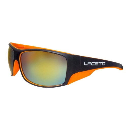 Okulary firmy Laceto, model CARL - sportowe okulary przeciwsłoneczne w kolorze czarny mat z pomarańczowymi wstawkami i kolorowymi szkłami REVO, o stopniu ochrony przed szkodliwymi promieniami - S3, 100° UVA, UVB, UVC.