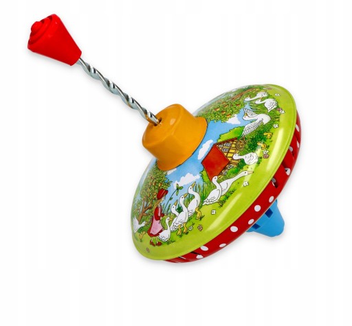Jedna z najbardziej tradycyjnych zabawek dla malucha. Wystarczy energicznie nacisnąć kilka razy za tłoczek, aby metalowy bąk zaczął wirować, wydając przy tym charakterystyczny dźwięk.