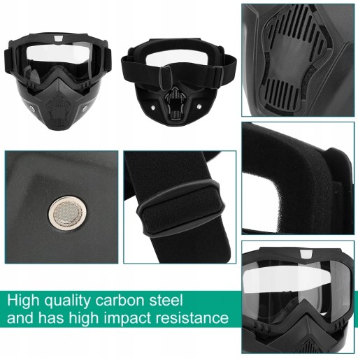 Cechy: Ten produkt jest wiatroszczelny, pyłoszczelny, odporny na promieniowanie ultrafioletowe i chroni skórę. Maska składa się z czarnej odpinanej maski i osobnych żółtych gogli, która jest pełna osobowości, prostoty i mody. Okulary charakteryzują się dużą wytrzymałością i posiadają funkcje antybalistyczne, przeciwmgielne i antyultrafioletowe. Rama wykonana jest z bardzo wytrzymałego tworzywa TPU, które można swobodnie zginać i ma wysoką odporność na uderzenia. Gogle idealnie dopasowują się do Twojej twarzy, sprawiając, że czujesz się komfortowo i nieskrępowanie. Wnętrze odłączanego, oddychającego ochraniacza na usta jest wyposażone w czystą i higieniczną gąbkę filtracyjną, aby zapobiec bezpośredniemu kontaktowi ust z maską, co jest zdrowsze i bardziej rozsądne. Po obu stronach maski znajdują się dwa otwory wentylacyjne. System wentylacji wewnątrz maski naturalnie krąży, a powietrze jest świeższe. Część tkacka jest wykonana ręcznie i dobrze się sprawdza. Korpus główny wykonany jest z wysokiej jakości stali węglowej i charakteryzuje się wysoką odpornością na uderzenia. Taśma może być regulowana w zależności od rozmiaru głowy, dzięki czemu jest wygodniejsza w noszeniu.