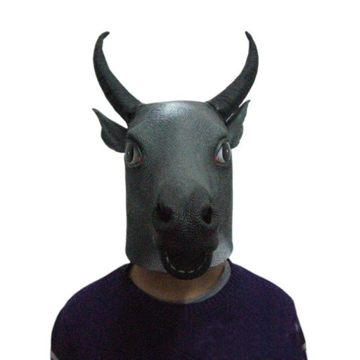 Maska szarego byka z dużymi rogami, wytrzeszczonymi oczami, idealna na przebieranki, imprezy tematyczne i reprezentacje.