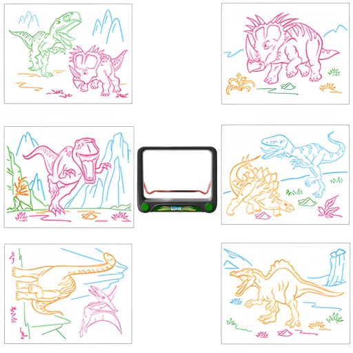 W zestawie znajdują się 3 dwustronne szablony z przykładowymi wzorami dinozaurów. Po podłożeniu pod główny panel do malowania można je odrysować i pokolorować. Gdy dzieło jest skończone włączamy podświetlenie i super efekt gwarantowany.