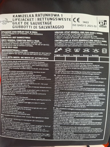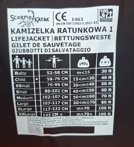 Kamizelka ratunkowa wyprodukowana zgodnie z normą CE PN-EN ISO 12402-5:2021-02.
