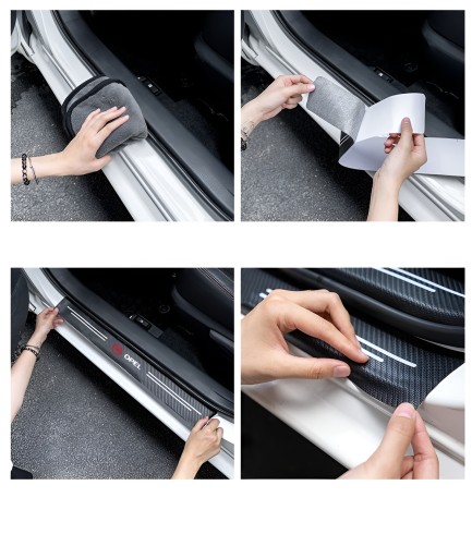 2.Dopasuj naklejki do progów, zacznij aplikować od jednego końca naklejki, naklejaj powoli by uniknąć pęcherzyków powietrza.