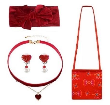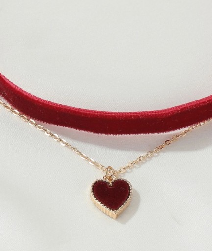 - Naszyjnik, choker z czerwonego aksamitu, zdobiony złotym łańcuszkiem z wisiorkiem w kształcie czerwonego serca,