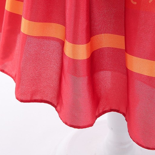 - Suknia wykonana z pięknych materiałów w odcieniach koloru pomarańczowego i czerwonego, a całość sukni dopełniona unikalnymi wzorami,