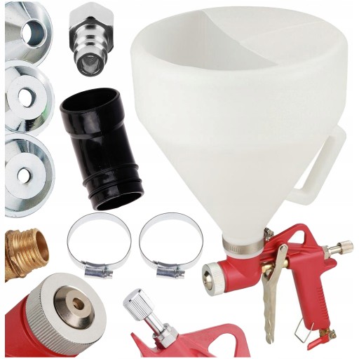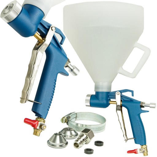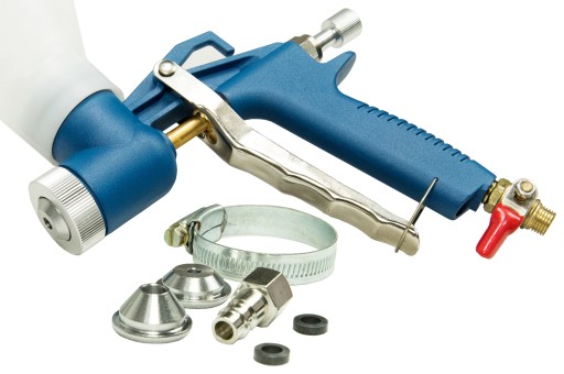 Uniwersalny pistolet pneumatyczny do malowania, tynkowania, gipsowania. Pistolet przeznaczony jest do malowania farbą emulsyjną, farbami klejowymi, do bielenia wapnem jak również do nanoszenia tynków akrylowych na docieplenia. Idealnie nadaje się do nanoszenia tynków, gładzi gipsowych, można nim robić fakturę czyli tzw. "baranka" na ścianie. Pojemnik pistoletu zakryty jest do połowy, co umożliwia malowanie sufitów bez stosowania żadnych dodatkowych kolanek, pokryw itp. rozwiązań. Pistolet wykonany jest całkowicie z aluminium, więc jest lekki i wygodny w eksploatacji oraz łatwy w czyszczeniu i wytrzymały. Ciśnienie potrzebne do pracy pistoletu powinno wynosić około 2 - 4 atmosfer.