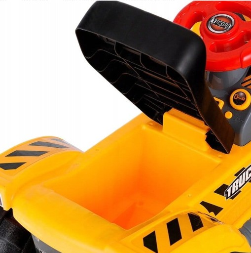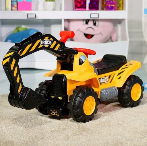 Unikalny design - koparka została zaprojektowana tak, by naśladować prawdziwą maszynę i wydaje realistyczne dźwięki pracy. Koparka została wyposażona w ręcznie sterowaną łyżkę oraz ukryty pod siedzeniem schowek. Do zestawu dołączony został kask oraz zabawkowy kamień