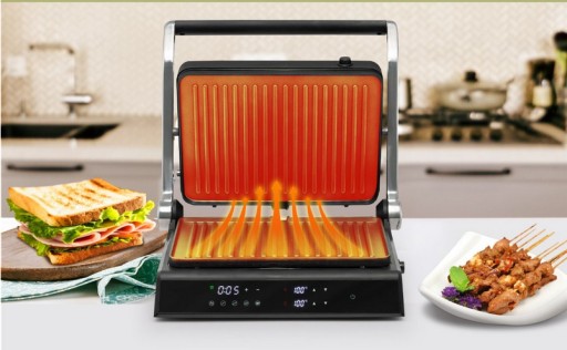 Niezależna kontrola temperatury: Ten potężny elektryczny grill do panini wyposażony jest w rurkę grzewczą ze stali nierdzewnej, która zapewnia szybkie i równomierne nagrzewanie. Dodatkowo temperaturę górnej i dolnej płyty grillowej można regulować niezależnie od 90℃ do 230℃. A antypoparzeniowy uchwyt zapewnia wysokie bezpieczeństwo.