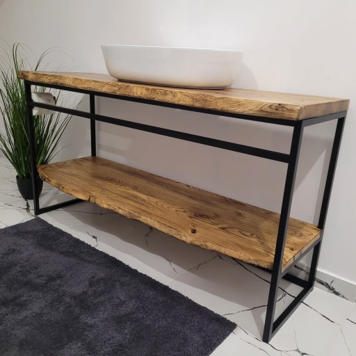 Przedmiotem sprzedaży jest metalowa konsola z relingiem na ręczniki i dwoma blatami z litego drewna dębowego o grubości 40mm (górny blat) 25 mm (dolny blat). Oflis blatu jest nieregularny.