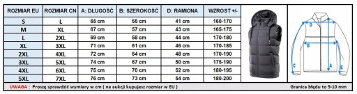 - Rozmiary EU : S M L XL 2XL 3XL 4XL 5XL ( na metce może być rozmiar w CN )