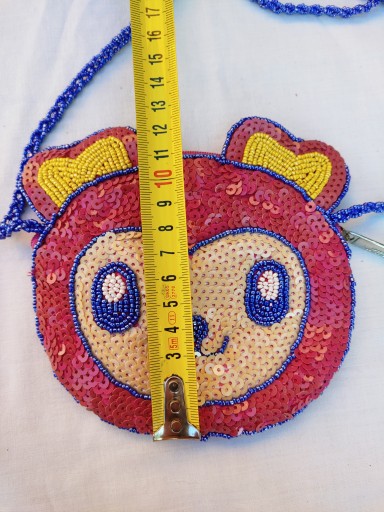 torebka cekinowa firma United colors Of Benetton, cekinowa panda, zapinana na zamek, długi pasek pleciony z koralików, długośc paska 120cm,, używana w stani edobrym bo ma lekkie przybrudzenia materiału satynowego - patrz zdjecia.