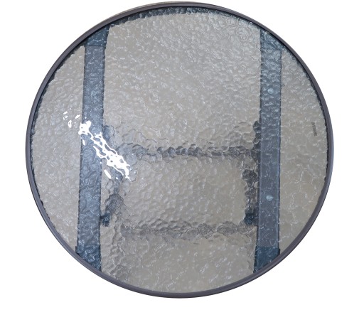 Stolik posiada okrągły blat wykonany z hartowanego szkła. Jest on odporny na warunki atmosferyczne i uszkodzenia mechaniczne. Dzięki temu, nie musisz martwić się jego rozbiciem gdy przypadkowo zostanie uderzony filiżanką lub talerzem. Na obrzeżach blatu znajduję się czarna ramka, która zabezpiecza jego krawędzie i dodaje wyjątkowego charakteru.