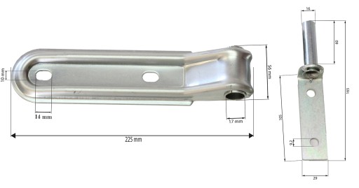 Zestaw składający się z zawiasu oraz uchwytu, montowanych na burtach przyczepek samochodowych. Oba elementy wykonane zostały ze stali ocynkowanej. Długość samego zawiasu wynosi 225 mm, a średnica jego otworu to 17 mm. Uchwyt posiada dwa otwory montażowe o średnicy 10X14 mm.