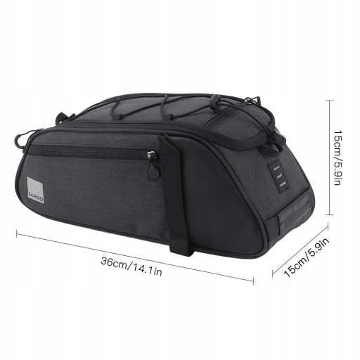 - Mocowana do bagażnika za pomocą dwóch pasków na rzep.