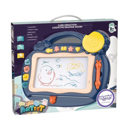 Znikopis Tablica Magnetyczna daje możliwość kreatywnej zabawy na długi czas! Tablica zachęca do pisania i rysowania. Rysowanie pozwoli skoncentrować, wyciszyć i uspokoić Twoje dziecko. Znikopis pozwala na tworzenie nieskończonej ilość obrazków – wystarczy przejechać specjalnym suwakiem, a rysunek zniknie i można rysować od nowa! Zestaw dodatkowo zawiera wygodny długopis oraz aż 4 stempelki, które urozmaicą dzieło. Dodatkowo 5 multi funkcyjnych guzików wydających dźwięk: efekty dźwiękowe (7 rodzajów), piosenki dla dzieci (2 rodzaje), taneczne piosenki (2 rodzaje), elektroniczne dźwięki (405 rodzajów), litery angielskie (26) oraz bęben (3 rodzaje dźwięków). Tablica posiada wygodny uchwyt, dzięki czemu dziecko może zabrać ją wszędzie oraz posiada możliwość wystawienia nóżek, które ułatwia pisanie przy stole dziecku. Znikopis rozwinie u dziecka zdolności manualne, wyobraźnie, kreatywność oraz da szansę na rozwinięcie artystycznej strony dziecka!