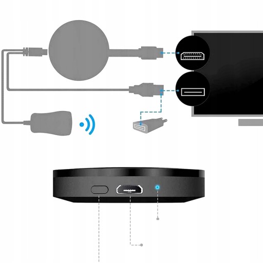 - W celu bezprzewodowego przesyłu obrazu, wystarczy że podłączysz nasz adapter do wolnego portu HDMI w swoim telewizorze, a przewód zasilający USB do wolnego złącza USB lub za pomocą ładowarki do kontaktu. Teraz przełącz telewizor na użyte właśnie złącze HDMI, a na swoim telefonie znajdź funkcję Przesyłu Obrazu.