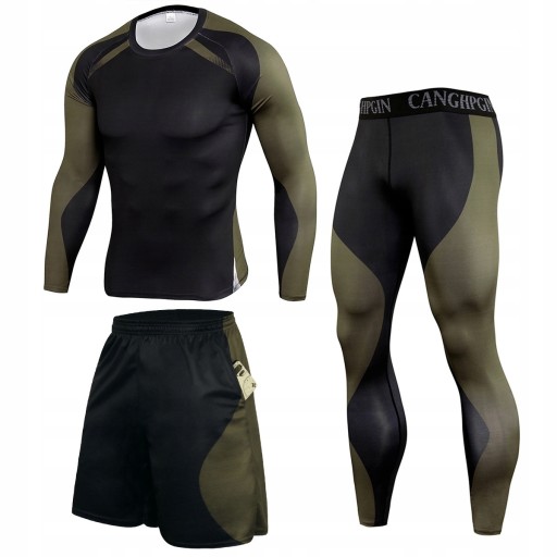 W skład kompletu wchodzi Rashguard Legginsy sportowe spodenki.