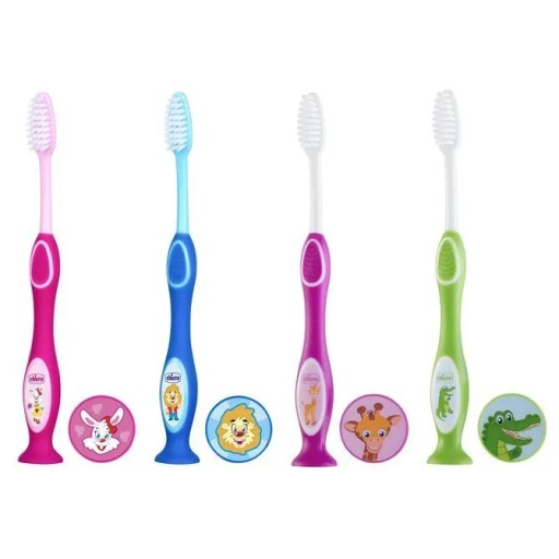 Miękkie włosie szczoteczki do zębów dla dzieci delikatnie usuwa osad nazębny, a tarka z drugiej strony główki skutecznie czyści język. Ergonomiczny kształt uchwytu i przyssawka sprawiają, że używanie szczoteczki jest wygodne i przyjemne. Osłonkę na włosie zdobią główki uroczych i zabawnych postaci. Codzienne mycie zębów szczoteczką dla dzieci Chicco to świetna zabawa!