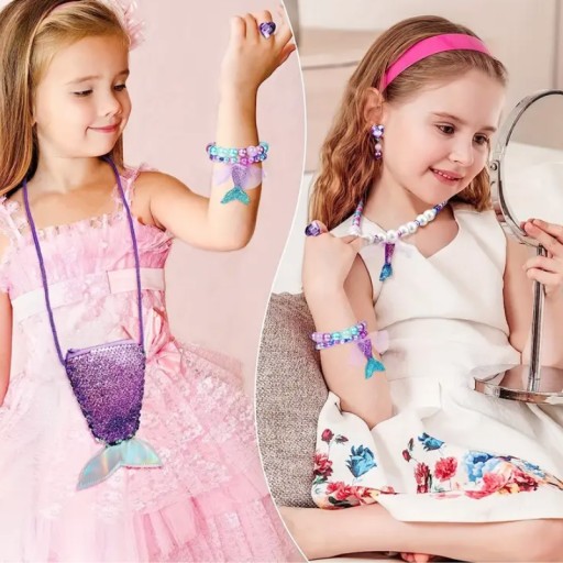 ❤️Naszyjnik z zawieszką w kształcie ogona syreny to absolutny hit tego zestawu. Wykonany z kolorowych koralików na elastycznej gumce, pięknie komponuje się z każdą stylizacją. Jego subtelny design sprawi, że każda dziewczynka poczuje się wyjątkowo i zachwyci swoich przyjaciół.