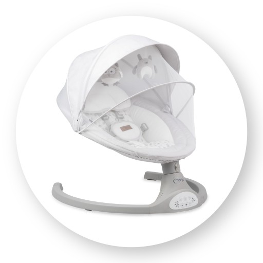 MoMi Kenani to wygodny i przestronny bujak elektryczny dla dziecka do 9 kg. Dzięki przypinanemu daszkowi oraz dodanej do zestawu moskitierze, idealnie sprawdzi się nie tylko w pomieszczeniu, ale także w ogrodzie czy na tarasie.