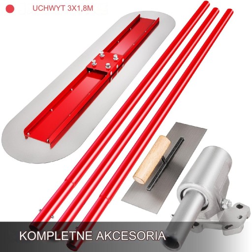 Zestaw do betonu zawiera pacy wykończeniowe, wspornik oraz trzy uchwyty montażowe, tworząc kompletny zestaw o długości 1,8 m. Dodatkowo dołączona jest mała kielnia, dodatkowo zwiększająca jego wszechstronność.
