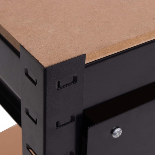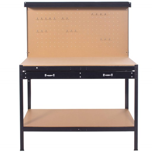 - Stół warsztatowy wyposażony w następujące elementy: blat roboczy, szuflada pod blatem, półka dolna, półka górna, ścianka z otworami