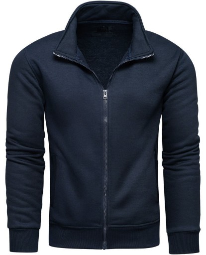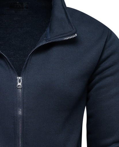 Bluza z stójką - ta ciemno-granatowa męska bluza będzie w sam raz nie tylko na siłownię czy jogging ale też na co dzień. Bluza posiada kieszenie po bokach oraz ściągacz na dole i na rękawach. Skład materiału: 65% bawełna, 35% poliester.