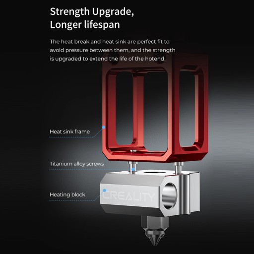 - All-metal design for better overall performance Support 300 ℃ printing and compatible with various filaments such as PLA, ABS, PETG, TPU, PP, PC, nylon, PEEK, PEI, etc. The heat break and heat sink are perfect fit to avoid pressure between them, and the strength is upgraded to extend the life of the hotend.