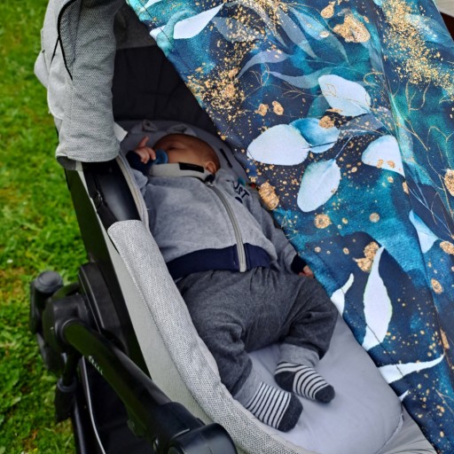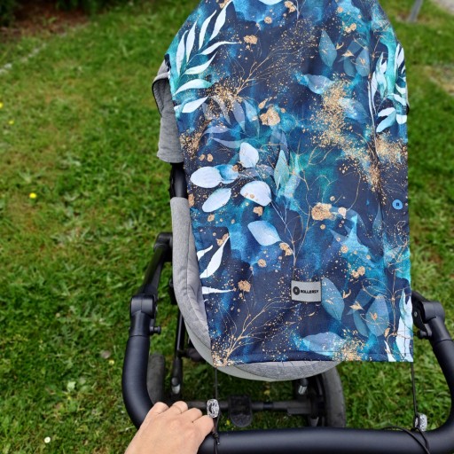Osłona na wózek mocowana jest na gumkę – z jednej strony zahaczamy gumkę pod gondolą lub z tyłu pod spacerówką, a pozostałe dwa końce zahaczamy o rączkę wózka pętelką za stopery, które można przesunąć w dowolne miejsce. Osłona wykonana jest z wodoodpornej tkaniny, a po złożeniu zajmuje bardzo niewiele miejsca, bez problemu wrzucisz ją do kieszeni pod wózkiem