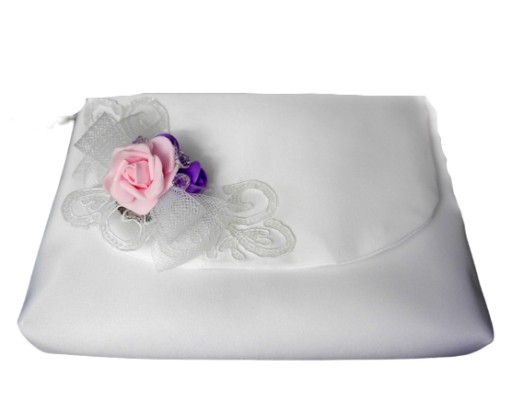 Torebka satynowa prostokątna. Uszyta z trzech warstw materiału: satyny ślubnej, sztywnego tiulu i podszewki satynowej. Ozdobiona kolorową przypinką. Do torebki na pozostałych aukcjach można dopasować profitkę na świecę komunijną satynowa, rękawiczki oraz wianek. Produkt Polski