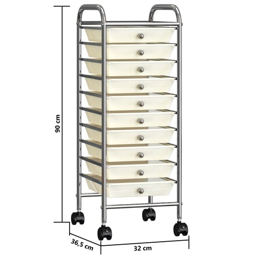 Chromowana rama zapewnia solidne i trwałe podparcie dla ciężaru, a 10 wyjmowanych, przestronnych koszy pozwala na swobodne przechowywanie przedmiotów. Szuflady łatwo się wyjmuje i czyści. Ponadto wózek wyposażono w 4 skrętne kółka, które ułatwiają transport oraz przechowywanie.