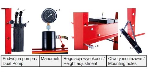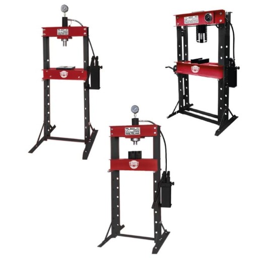 Prasa hydrauliczna stacjonarna posiada stabilną, ramową konstrukcję z regulowaną wysokością środkowej belki – stołu do podpierania wyciskanych elementów. Prasa posiada manometr oraz silną i wydajną pompę hydrauliczną z dwoma tłokami do pracy szybkiej i precyzyjnej. Napęd pompy ręczny. Prasa wyposażona jest w podstawowe podpory do wyciskanych elementów oraz przesuwany w prawo i lewo siłownik hydrauliczny.