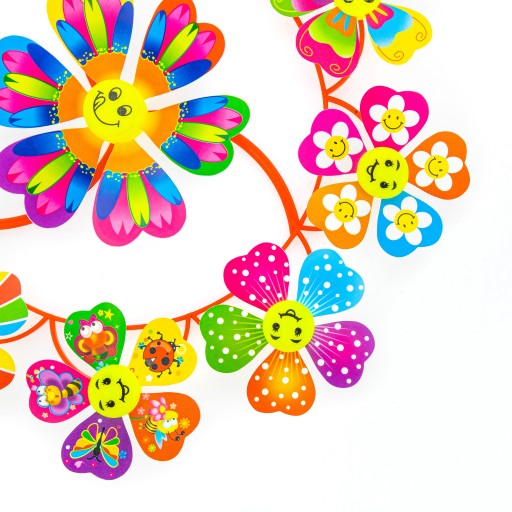 ✨Nasz wiatraczek jest dużych rozmiarów, udekorowany kwiatuszkami w różnych wzorach oraz żywych i pięknych kolorach. Pobudza dziecięcą wyobraźnię i daje wiele radości.