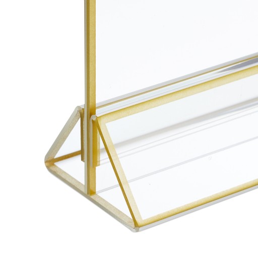 Zestaw 6 ramek na zdjęcia do postawienia to praktyczne rozwiązanie do zastosowań prywatnych i komercyjnych. Czy to jako stojąca ramka na zdjęcia w domu lub na uroczystościach, czy też do prezentacji kart menu i materiałów reklamowych. Stojaki na zdjęcia zachwycają dyskretnym designem wykonanym z przezroczystego akrylu ze złotą krawędzią. Dwustronne ekspozytory oferują miejsce na 2 strony w formacie DIN A6. Aby zmienić zawartość, wystarczy lekko rozsunąć ramki ekspozytora.Parametry uchwytu na zdjęcia- wymiary: ok. 19 x 11 x 6 cm (wys. x szer. x dł.)- odpowiedni format: DIN A6- grubość krawędzi: ok. 3 mm- waga: ok. 100 g każdy- materiał: akryl- kolor: przezroczysty, złotyWszechstronna ramka na zdjęcia o nowoczesnym wyglądzie- na zdjęcia, kartę menu lub materiały reklamowe- tabliczki odpowiednie do użytku prywatnego i komercyjnego- możliwość wymiany zawartości- wykonane z przezroczystego akrylu i złotej ramki- dwustronny stojak na zdjęcia na maksymalnie 2 strony w formacie DIN A6- folia ochronna na płycie i stojaku zapewnia transport bez zarysowańZakres dostawy- 6x stojak na karty menu- elementy dekoracyjne nie wchodzą w zakres dostawy