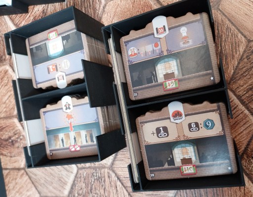 Przedmiotem sprzedaży jest insert pasujący do gry Carnegie wydrukowany w kolorze czarnym z kolorowymi organizerami graczy.