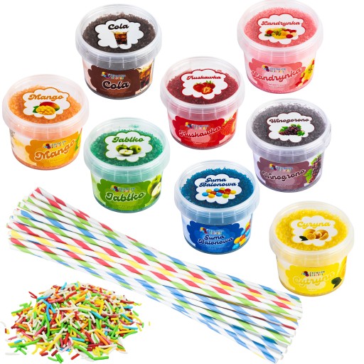 Zestaw obejmuje cukry w następujących kolorach i zapachach: