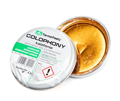 Kalafonia aktywna do lutowania od AG Termopasty. Pojemność 40g. Wykorzystywana w lutownictwie, spawalnictwie, może być również składnikiem lakierów i farb itd. Nie powoduje korozji metali ani zwarć. Przenika przez najtrudniejsze miejsca, czyści i przygotowuje powierzchnię i poszczególne elementy do lutowania. Ułatwia przyczepność i płynność cyny. Doskonale nadaje się do lutowania stopem cynowo-ołowiowym. Posiada podobną wartość do aktywności pasty lutowniczej. Kalafonia wykorzystuje się również jako bazę do topnika wzorcowego, gdzie stanowi 25% roztworu w alkoholu izopropylowym. Kalafonia zamknięta jest w metalowym pudełku.