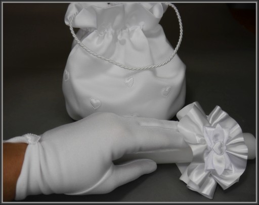 Torebka do komunii w kształcie sakiewki wykonana z satyny ślubnej pierwszego gatunku, ozdobiona białymi satynowymi serduszkami. Woreczek posiada sztywną wkładkę która pomaga w zachowaniu jego kształtu nawet po obciążeni. Na pozostałych aukcjach można kupić ją w zestawie z rękawiczkami i okapnikiem