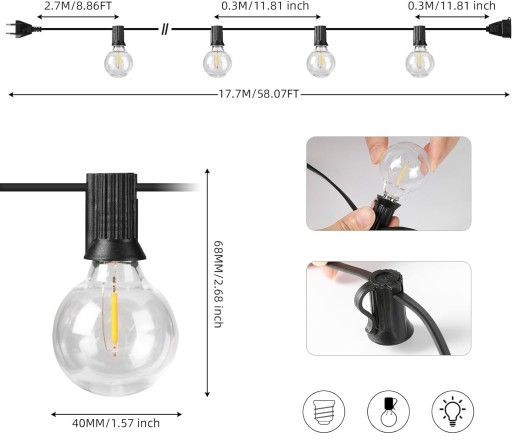 Każde gniazdo jest wyposażone w klips, co sprawia, że girlanda jest gotowa do zawieszenia, bez żadnych dodatkowych zacisków. Girlanda jest całkowicie dostosowana do wszelakiego sposobu zawieszenia, masz ochotę zawiesić co drugi punkt? Żaden kłopot ! To sprawia, że instalacja jest bardziej elastyczna i dostosowana do Twoich potrzeb.