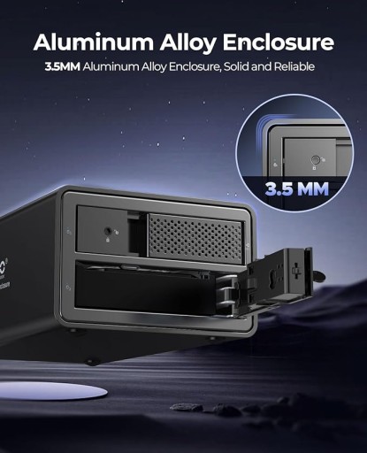 Pełna ochrona - obudowa dysku twardego 2 Bay jest wyposażona w obudowę unibody ze stopu aluminium o grubości 3,5 mm, odporność na ścieranie i ścieranie, dzięki czemu skutecznie spowalnia skutki upadków i zapobiega uszkodzeniom danych dysku twardego.