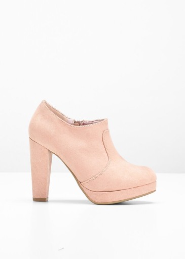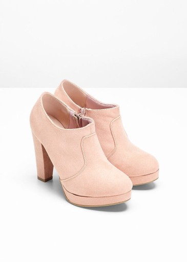 Botki do kostki z zapięciem na zamek, ze sztucznej skóry welurowej. Na obcasie słupku o wys. 11 cm.