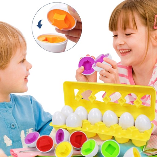 Łączenie połówek: Połówki jajek posiadają wypukłe i wklęsłe formy różnych figur i innych kształtów, które należy połączyć ze sobą. To zadanie nie tylko rozwija umiejętność rozpoznawania kształtów tj. krzyżyk, strzałka, serduszko, kółko lub kwiatuszek, ale także motywuje dzieci do logicznego myślenia i trenuje pamięć. Poprzez dopasowywanie połówek jajek, dzieci uczą się koncentracji, cierpliwości oraz wytrwałości w dążeniu do osiągnięcia celu.