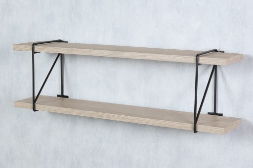 Podwójna półka ścienna marki FURNITECO jest wykonana z najwyższej jakości materiałów. Półki stanowi płyta meblowa w kolorze dąb sonoma, produkowana przez firmę KRONOSPAN. Wsporniki marki MAVÖ (model: NOLAN.B) przy pomocy których półki są mocowane do ściany prezentują najwyższą jakość. W komplecie znajdują się czarne wkręty do drewna przy pomocy których przytwierdzimy półki do wspornika. Ponieważ miejsce montażu półki może mieć różnorakie właściwości, należy samodzielnie zaopatrzyć się w odpowiednie wkręty / kołki montażowe - nie ma ich w komplecie!