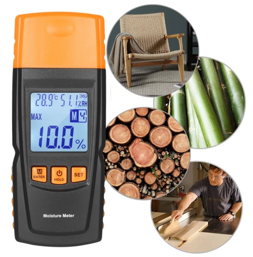 Kompaktowe i wytrzymałe urządzenie pomiarowe do szybkiego określania wilgotności materiału - w drewnie opałowym, drewnie tarcicowym, płytach wiórowych, fornirze, a także do papieru, roślin leczniczych i bambusa oraz innych tego typu materiałach.
