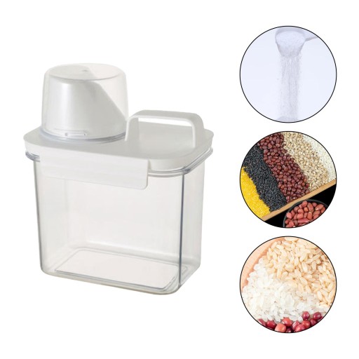 [Wielofunkcyjny]: pojemnik do przechowywania to doskonały sposób na przechowywanie i organizację w kuchni i domu, który może pomieścić detergent do prania, proszek do prania, mydło w płynie, ryż, cukier, suchą karmę, przekąski, fasolę, karmę dla zwierząt domowych i wiele innych.