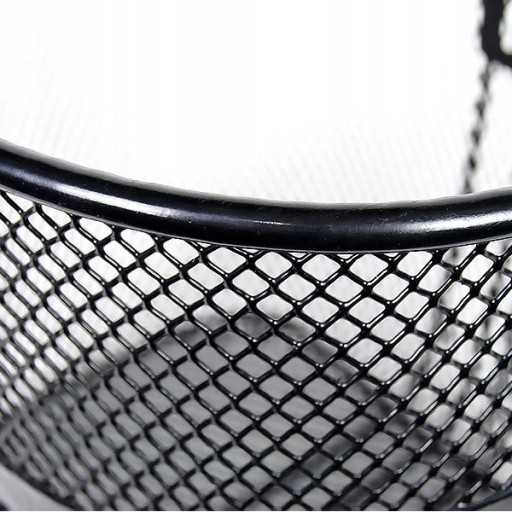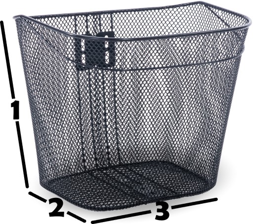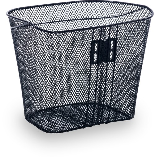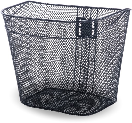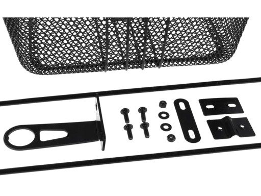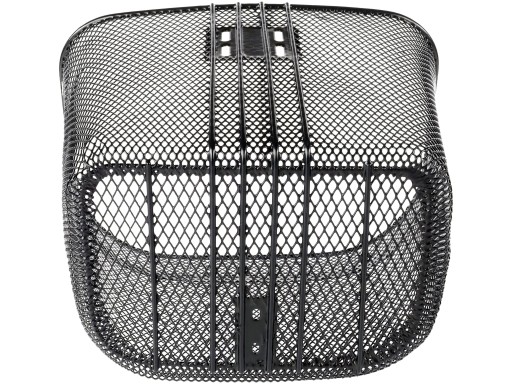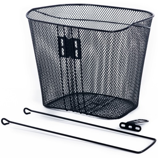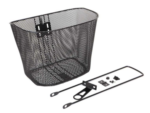 Uniwersalny koszyk przeznaczony do montażu na stałe do kierownicy roweru ze wspornikiem dolnym mocowanym do osi koła. Wykonany ze stalowej siatki emaliowany na czarno, dno wzmocnione stalowymi prętami, mocowany na uchwycie pod lożyskiem kierownicy na uchwyt 25,4 mm (1").