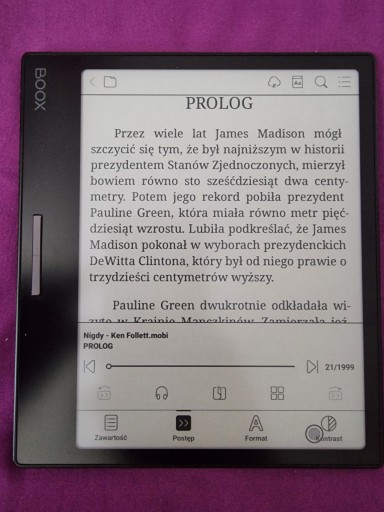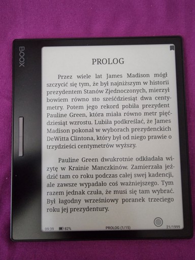 Fajnie, że Pani lub Pan zajrzeli na moją ofertę. Dziś sprzedaję elektroniczny czytnik książek marki Onyx Boox Leaf. Czytnik wyposażony w ekran 7 cali. Stan jak na zdjęciach moim zdaniem bardzo dobry. Mi czytało się łatwo i przyjemnie. Czytnik odczytuje polską czcionkę, bateria, w mojej ocenie trzyma bardzo dobrze. Sprzedaję czytnik wraz z kompletem sprzedażowym. Czytnik wyposażony w system operacyjny Android można zainstalować Legimi, EmpikGO itp.itd. Ekran Eink wyposażony w regulację barwy światła ciepła/zimna. Sprzedaje tylko i wyłącznie ze względu na kiepskie finanse. Czytnik posiadam ponad rok, jest po gwarancji Producenta. Sprzedaję czytnik z oryginalnym pudełkiem.