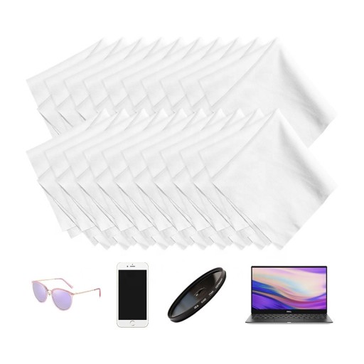 Zestaw 20, osobno zapakowanych, miękkich ściereczek z mikrofibry wielokrotnego użytku do bezpiecznego czyszczenia wszelkich powierzchni optycznych: obiektywy, filtry, okulary, ekrany itp.