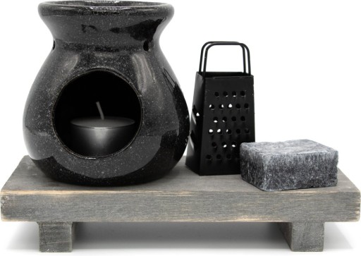 Uroczy zestaw składający się z kominka na wosk lub olejek zapachowy ze świeczką typu tealight, wosku, tarki oraz podstawki z serii Vesuvius - with love. Ceramiczny kominek jest koloru czarnego nakrapianego, błyszczącego imitującego marmur. Naczynie umożliwia rozpylenie zapachu wosku lub olejku zapachowego. Do użycia potrzebna jest świeczka typu tealight (świeczka zawarta w zestawie), którą umieszcza się w środku kominka.