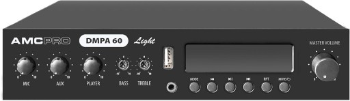 DMPA 60 Light to wzmacniacz audio klasy D 60 W z przełącznikiem zasilania i transformerem wyjściowym 100 V. z odtwarzaczem USB z wejściem AUX, odbiornikiem Bluetooth i radiem FM, 1 wejście mikrofonowe. Ta seria została zaprojektowana do małych miejsc publicznych, takich jak stacja gazowa, małe sklepy, bary, pokoje do wakacji lub w innych miejscach, które wymagają kompaktowego, niezawodnego i łatwego do pracy systemu audio do ciągłego użytku. Seria lamp Dmpa Light jest wyjątkowo kompaktowa i lekka – wymiary to tylko półrack 1U.